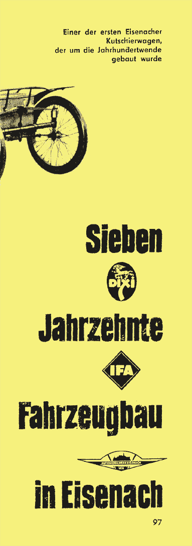 waren, Fahrzeuge zu fertigen, bei de- nen sich höchste Präzision und Sorg- falt in Konstruktion und Herstellung, erstklassige Qualität der verwendeten Ausgangs- und Rohmaterialien sowie Zuverlässigkeit und Sicherheit in der Funktion die Waage hielten. Dem ersten Wartburg um die Jahr- hundertwende folgten andere Fahr- zeuge, so schon 1902 ein Rennwagen, der eine Spitzengeschwindigkeit von 120 km/h erreichte. Bald danach er schienen die Eisenacher Erzeugnisse unter dem Namen "Dixi", der sowohl |