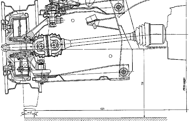 ![]() 3 ![]() 4 ![]() 5 gelenkseitige Abdichtung des Fettraumes mit Simmeringen und zusätzlicher Staubkappe auch von seiten des Gelenkes garantiert. Die Radbremstrommel übergreift den Radmitnehmer und kann nach Lösen des Laufrades abgenommen werden, so daß Wartungs- arbeiten an der Bremse ohne nennenswerten Montageaufwand durchgeführt werden können. Der Antrieb der Vorderräder erfolgt über eine homokinetische Antriebswelle, bei der das bisherige Gummigelenk am Getriebe durch ein Dreiarmgelenk mit Längenausgleich ersetzt wird, während radseitig die Doppelgelenkkonstruktion, wie sie seit einiger Zeit beim Wartburg Verwendung findet, beibehalten wird. Dabei konnte allerdings der zulässige Beugungswinkel zur Erreichung großer Rad- einschlagwinkel für den oben angeführten Wendekreis von 10.2 m auf 43° erhöht werden. Mitlaufende Manschetten am äußeren und inneren Gelenk garantieren eine staub- und wasserdichte Kapselung und damit eine wartungsfreie Betriebszeit der Gelenkwellen von 100 000 km. Hinterachse Die Hinterachskonstruktion ist gegenüber der bisherigen Starrachse durch einzeln aufgehängte Räder gekennzeichnet, die durch Schräg- pendelarme geführt werden (Bild 7). Der Anlenkungswinkel gegen- über der Fahrzeuglängsachse beträgt 64° und ist so gewählt, daß |