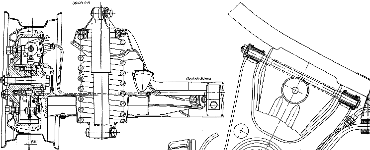 Die erwähnte Senkung des Geräuschpegels (siehe Bild 3) im Fahr- zeuginnern konnte durch verschiedene konstruktive Maßnahmen an der Motorgetriebeaufhängung und der Auspuffanlage erreicht werden. Insgesamt repräsentiert der Wartburg 1000-312 trotz seines kaum veränderten äußeren Aussehens gegenüber seinem Vorgänger einen PKW der Mittelklasse, der den Anforderungen des modernen Ver- kehrs vollauf gerecht wird. Die Konstruktionsdetails und technischen Parameter - insbesondere des neuen Fahrwerks - werden im fol- genden beschrieben. Rahmen Basis des Fahrgestells ist wie beim Vorgängertyp 311 ein verwin- dungssteifer Kastenprofilrahmen, dessen beide Längsträger auf Grund der Verlegung der Auspuffleitung in die Fahrzeugmitte unter dem Fahrgastraum bis an die Karosserieaußenkante herausgezogen sind. Mit entsprechender Ausbildung der Querversteifungen und angeschweißten Konsolen nimmt er alle Aggregate des Fahrgestells auf, u. a. auch das stehend angeordnete Fußhebelwerk und die Handbremse (Stockbremse) sowie den in sich geschlossenen Karos- seriekörper. Vorderachse und Radantrieb Die einzeln aufgehängten, angetriebenen Vorderräder werden durch obere und untere Querlenker geführt (Bild 6). Die Federung erfolgt durch linear gewickelte Schraubenfedern, die sich einerseits auf dem oberen, kurzen Querlenker und andererseits über eine geräusch- und schwingungsdämpfende Gummizwischenlage am Rahmenfeder- träger abstützen. Zur Erzielung einer weichen Federkennung im Hauptarbeits- bereich der möglichen Belastungsfälle des Fahrzeugs ist zur Auf- nahme starker dynamischer Beanspruchungen die Federkennung durch Zuschaltung einer ebenfalls auf den oberen Querlenker wir- kenden Gummizusatzfeder progressiv gestaltet. Die Abstimmung dieser Zusatzfeder, die zugleich die Federwegbegrenzung beim Einfedern darstellt, ist so gewählt, daß der Übergang zur steileren Federkennung bei entsprechend starker Einfederung ohne spürbaren Unterschied erfolgt, so daß starke Fahrbahnstöße elastisch abge- fangen werden. Die untere Federwegbegrenzung erfolgt durch einen Gummipuffer, der bei maximaler Ausfederung den oberen Quer- lenker abfängt. Die mit der gewählten Anordnung erzielte Feder- kennung und die Wege sind im Bild veranschaulicht. Bei einem Gesamtfederweg von 165 mm beträgt die spezifische Federkennung im Hauptarbeitsgebiet 27 (14) mm/100 kp Achslast, wodurch eine Schwingungsfrequenz bei zulässiger Achslast von 77 (114) min-1 bei einer Eigenreibung von rd. 60 (100) kp erreicht wird. Die Klammerwerte geben vergleichsweise die entsprechenden Werte der bisherigen Blattfederung an. Dabei setzt der für die Eigen- reibung der Blattfederung angegebene Wert besten Pflegezustand voraus. Im Fahrbetrieb kann die Eigenreibung bis zu 160 kp und mehr durch mangelnde Pflege anwachsen. Demgegenüber ist die Schraubenfeder wartungsfrei und garantiert die gleichbleibend guten Federungswerte unabhängig von der Laufzeit. Die Dämpfung der Federschwingungen erfolgt durch doppeltwirkende hydraulische Teleskopstoßdämpfer mit einer auf das Fahrzeug abgestimmten Optimaleinstellung von 80/50 kp (Zug/Druck) nach TGL 8114. Die vorderen Stoßdämpfer sind innerhalb der Schraubenfedern ange- ordnet und vom Motorraum her leicht auszuwechseln. Die aus einem Blechpreßteil hergestellten oberen und unteren Querlenker sind schwenklagerseitig in staub- und wasserdicht gekapselten Stahlkugelgelenken gleicher Ausführung oben und unten, sowie rahmenseitig in radial- und axialelastischen Gummi- bundbuchsen gelagert. Während die Fettfüllung der äußeren Kugel- gelenke für ein Wartungsintervall von 50 000 km bemessen ist, sind die Gummibundbuchsen wartungsfrei für eine Mindestlebensdauer von 100 000 km bemessen. (Schmiermittel für die Kugelgelenke: 12 g Ceritol THA 3 im Balgraum, 7 g Öl GHD-Graphitgemisch im Gelenkraum. Die Nachschmierung erfolgt nach Demontage der Manschette und Reinigen des Gelenkes durch eine Gewinde- bohrung im Gelenkdeckel [Öl-Graphitgemisch] sowie durch Auf- tragen von Ceritol THA 3 auf die Unterseite des Gelenkes.) Zur Radlagerung sind zwei Rillenkugellager mit innenliegendem Führungslager angeordnet. Die Aufnahme der Lager erfolgt einer- seits im Schwenklager-Schmiedeteil, andererseits in einer mit dem Schwenklager verschraubten Radnabe, deren Befestigung gleich- zeitig die Radbremsanlage mit erfaßt. Die Innenlagerung erfolgt nicht mehr wie bisher direkt auf dem äußeren Mitnehmer der Antriebswelle, sondern auf einer durch ein Innenprofil kraftschlüssig mit der Antriebswelle verbundenen Laufhülse des Radmitnehmers, so daß Radlager- und Antriebswellenmontage vollkommen ge- trennt durchgeführt werden können. Der ebenfalls für eine Laufzeit von 50 000 km bemessene Wartungszyklus wird durch die rad- und |