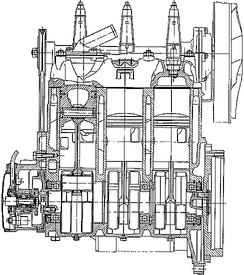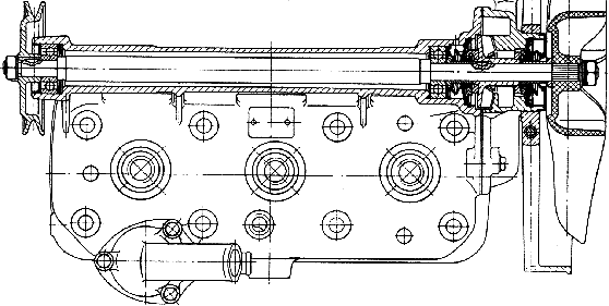 Bild 12 Schnitt durch den Motor des Wartburg 312 mit neuem Zylinderkopf und nadelgelagertem Kolbenbolzen Bild 13 Schnitt durch die Lüfter- wellenlagerung im neuen Zylinder- kopf. Man erkennt die in Lüfternähe befindliche Kühlmittelpumpe |